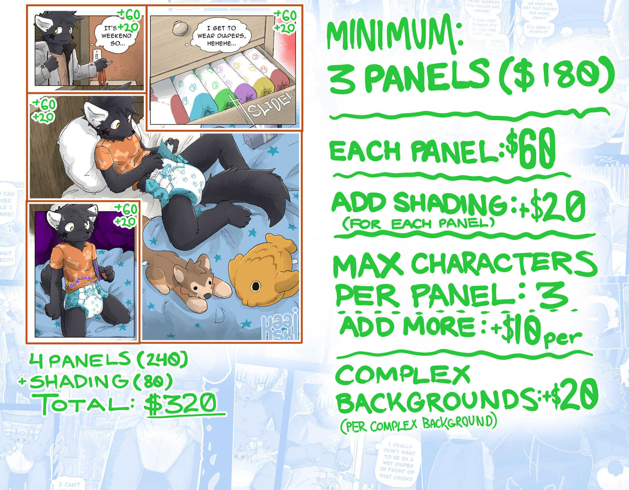 I'll draw comics, profile pictures, character refs... etc. Basically anything that isn't animation or 3D. I may not list prices for everything so ask if you're unsure how much I'll charge.